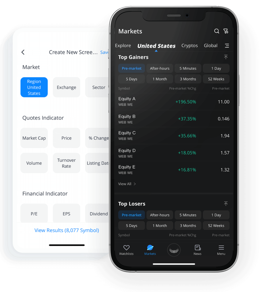 - Custom screeners to quicky sort through availabe stocks and ETFs
